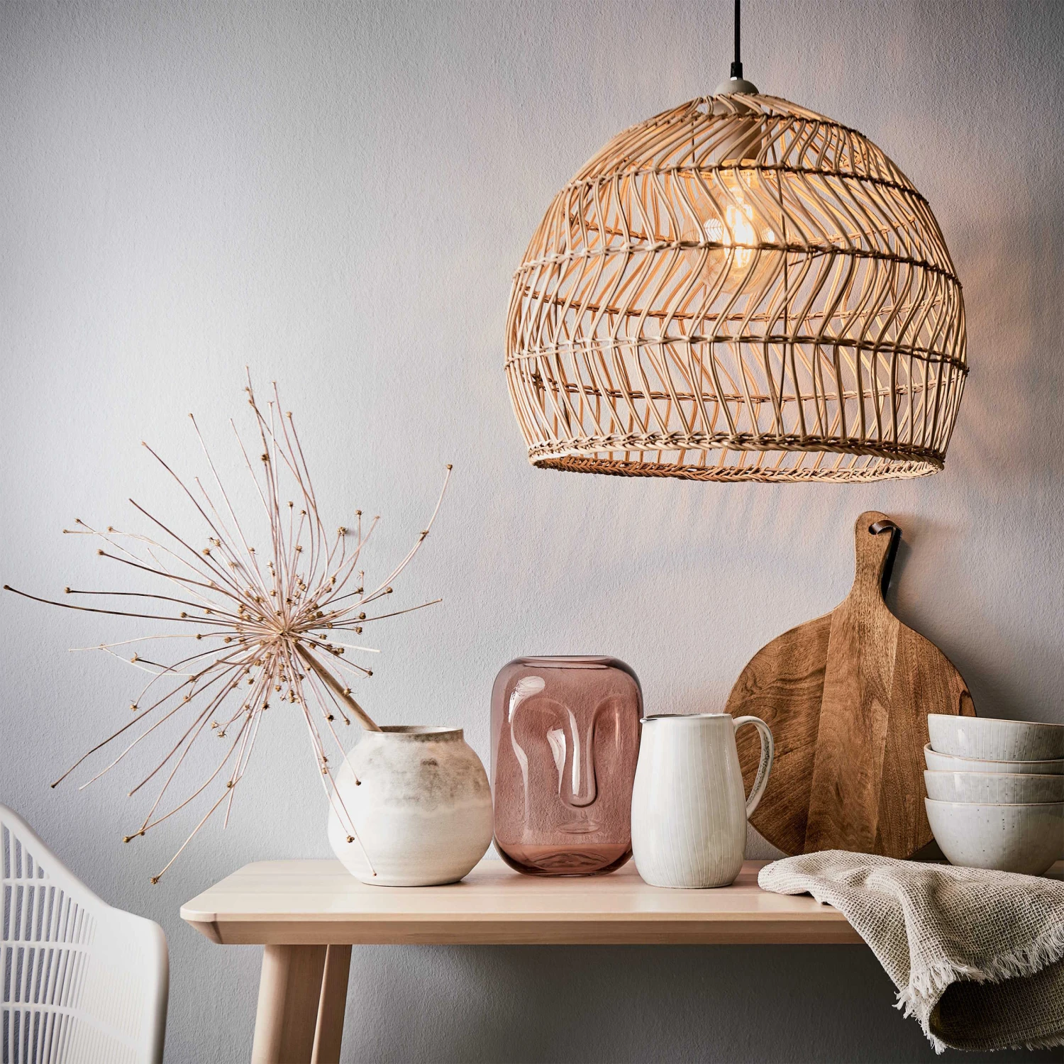Behagliches Licht, das zum natürlichen Wohntrend passt: Für den dekorativen Corbelle Lampenschirm aus handgeflochtenem Rattan verwenden Sie am besten Leuchtmittel mit Warmlicht (2.700 bis 3.300 Kelvin). So kann der Lampenschirm über dem Esstisch oder im Flur für eine harmonische Lichtstimmung sorgen, die – passend zu seinem Design – an den frühen Morgen oder späten Nachmittag in einer balinesischen Lodge erinnert. Mit Unikat-Charakter, ohne elektrische Installation. In einer weiteren Variante erhältlich.